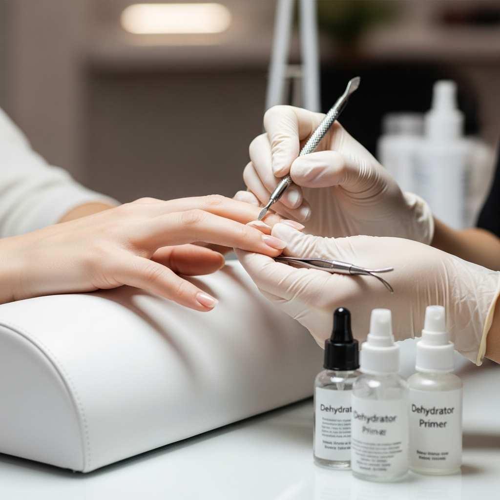 Following mechanical prep, a chemical dehydrator is applied to remove residual oils and moisture. In the U.S. nail industry, this step is mandatory for clients with oily nail plates or hyperhidrosis.