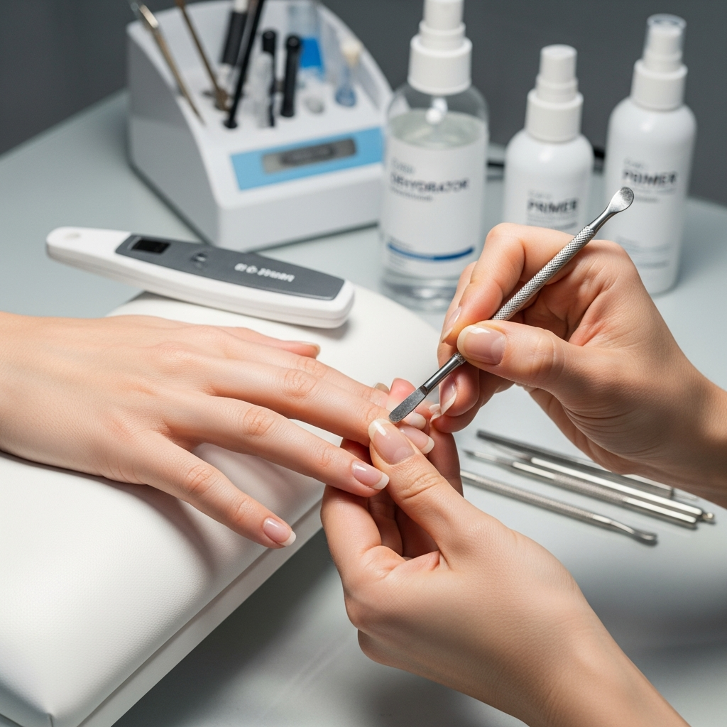 Following dehydration, a professional primer creates a chemical bond between the natural nail and the enhancement. This step anchors the product for the standard three to four weeks of wear.